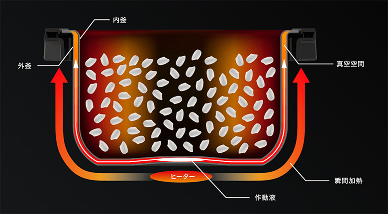 内釜の内部はくり抜かれ、厚さ4mmの真空空間があります。そこに作動液を入れます。底面から熱を受けると作動液は蒸気化し、内釜の隅々まで熱を伝えます。熱を伝えると作動液はまた液化しますので、また底に溜まる。それを繰り返すわけです。