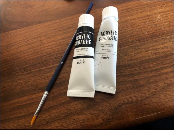 こちらはダイソーで購入しました。さらに、筆者が採用したデザインはスマホに絵を描いて仕上げるタイプです。アクリル絵の具と筆も用意。