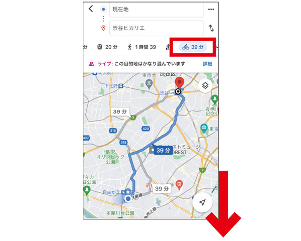 移動手段で自転車マークを選ぶ。時間や距離だけでなく、高低差や目的地の混雑度もわかる。
