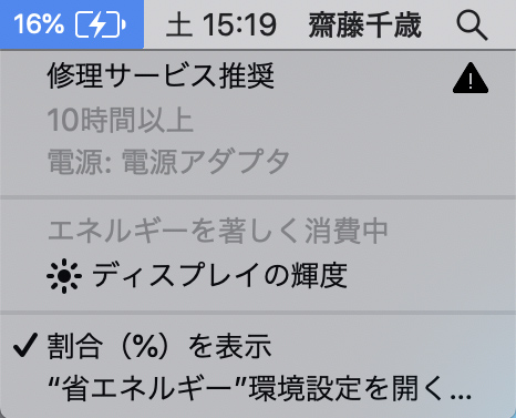 しかし、ある日、何気なく我が家のノートパソコンMacBook Pro 2017 13インチに、5V2.4A(12W)タイプのシガーソケットUSBから電源供給をしてみたのです。すると、電気は供給されますが、バッテリーは充電されない状態に。