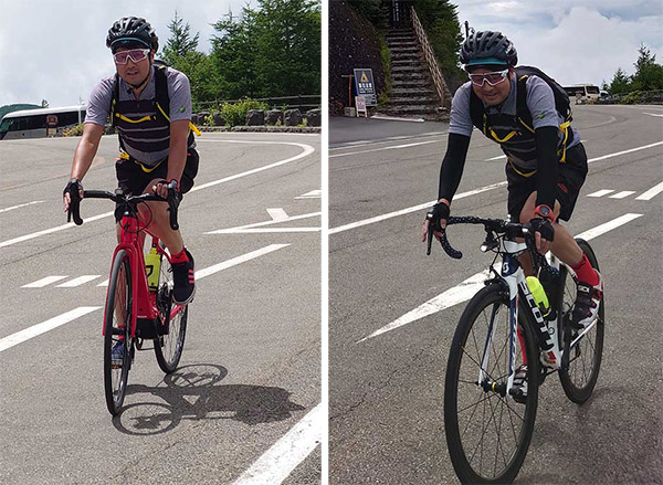写真左のe-bikeはターボモードだったこともあり、汗ひとつかいていない.。(e-bikeは18分、ロードバイクは29分)