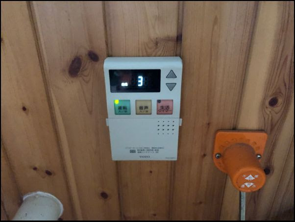 どうやら給湯器が部屋内にあり、こちらの温度を上げると解決するようです。画像では「3」と出ていますが「5」くらいにすると、20秒に1度の水が「ぬるいお湯」に変化します。