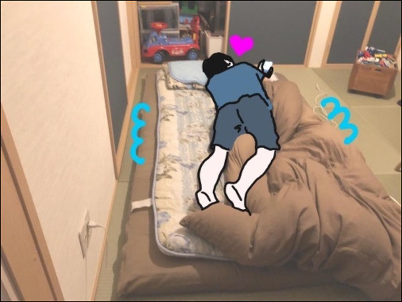 「汚い布団にわざわざブルーシートを敷く必要ある?」と思ったものの、嬉しそうにいそいそとシートのシワを伸ばしていたので、何も言いませんでした。