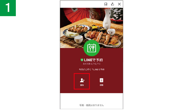 (1)LINEアプリの検索で、公式アカウント「LINEで予約」を見つけて友だちに「追加」する。