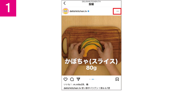 (1)アプリ画面で、投稿の右上にあるメニューアイコン「」をタップする。
