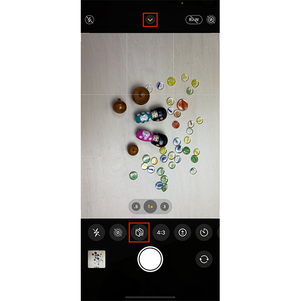 まず、カメラ画面上部の三角矢印ボタンをタップして、シャッターボタンの上に表示されるアイコンから、3枚の正方形が重なったものをタップします。
