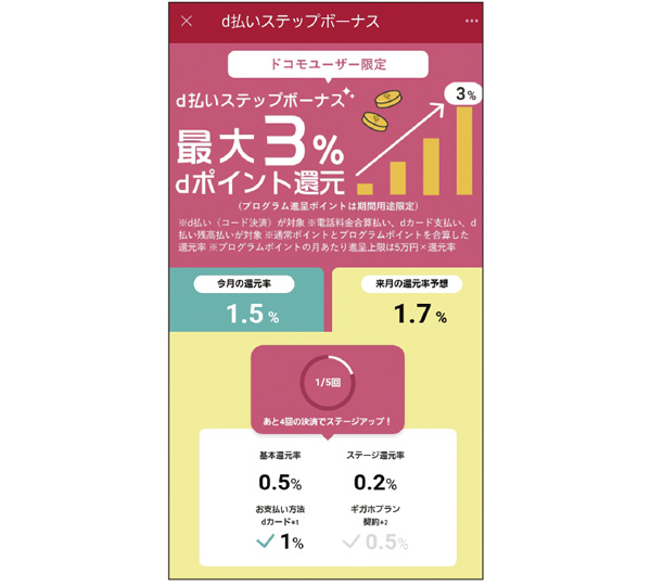 また、2021年9月1日に始まったドコモユーザー向けの「d払いステップボーナス」は、支払い回数に応じて翌月にプラス0.2~1%、ギガホプラン契約でプラス0.5%などがあり、「dカード」決済を含め、翌月の還元率が3%にアップする。