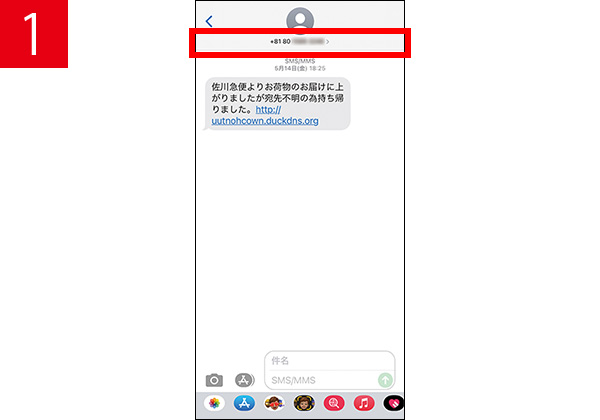 (1)宅配業者を名乗る人物からSMSが送られてきたら、画面上部の電話番号をタップし、「情報」をタップ。URLは絶対にタップしないこと。