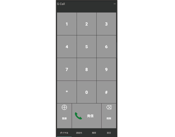 電話アプリの「G-Call」の画面。利用には事前登録が必要。いつもの電話番号で発信でき、料金は30秒で10円と、安い。