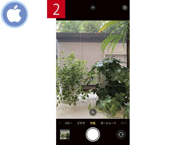 (1)iPhoneは「設定」アプリで「カメラ」→「グリッド」をオンにする。