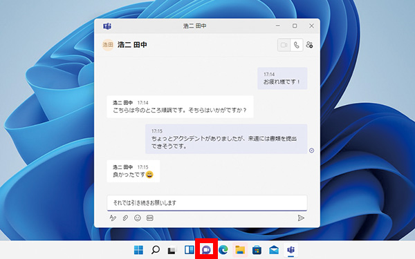 「チャット」アイコンをクリックすると、「Teams」が起動する。チャットが利用可能となる。