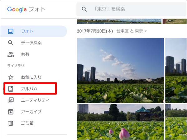 アルバム単位の写真ダウンロードを利用するには、まずブラウザー版のGoogleフォトにアクセス。次に、画面左端のサイドメニューから「アルバム」をクリックする。