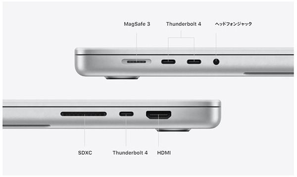 SDXCカードリーダー、HDMI、ヘッドフォンジャック、3つのThunderbolt 4ポート、MagSafe 3ポートに対応。