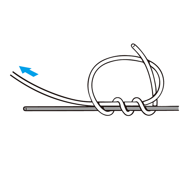 (5)完成 「二重テグス結び」と同じ要領だが、実際の釣りでは巻き数が多くて強固なこの結び方が使われる。
