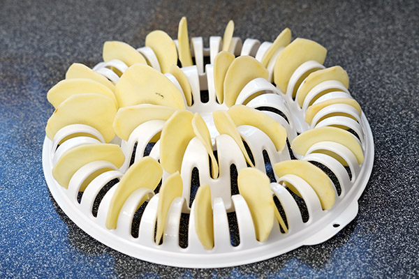 「電子レンジチップスメーカー」の本体は、白いプラスチック製のスリットの入った円盤といった印象です。このスリットにスライスした野菜を並べて、電子レンジでチンするだけで、野菜チップスが完成するといいます。購入しておいてなんですが、この時点で筆者は、本当に野菜チップスができるのか半信半疑です。