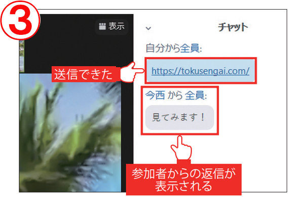 (5)「チャット」テキストメッセージで参加者とやり取りできる。クリックするとチャット画面が開く。