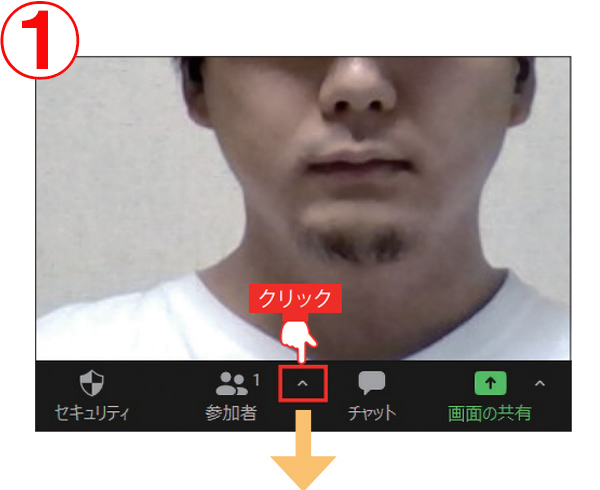 (1)「ミュート」クリックするとマイクがオフになり、自分の声が相手に聞こえなくなる。