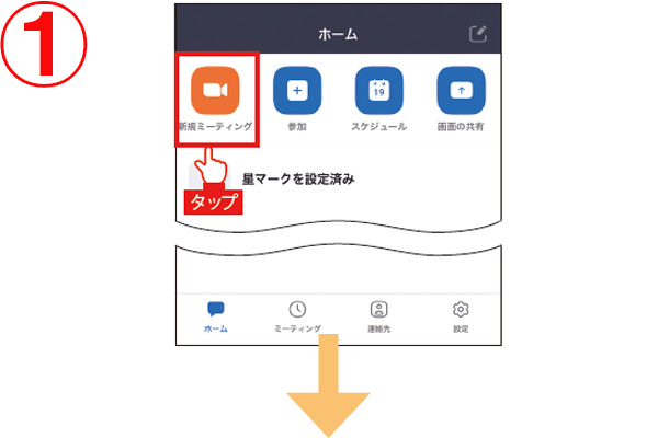 アプリを起動し、トップ画面で「新規ミーティング」をタップする。