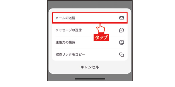 表示された中から招待方法を選択する。ここでは「メールの送信」をタップする。