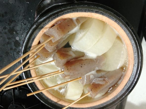 (1)土鍋に水を張り、昆布、皮を剥いてカットした大根(輪切り・半月切り)を入れる。
