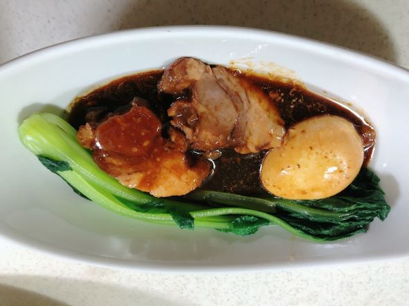 (5)鍋にカットした煮豚、ゆで卵、タレを入れてひと煮立ちさせる。