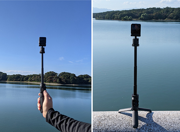 Action 2には同梱されていないが、Action2には、いろいろなアクセサリーが用意されている。その中でも、今回試したのは延長ロッドだ。これは、いわゆる自撮り棒のようなものになるが、自撮り棒と大きく違うのは、脚が三脚になることだろうか。この延長ロッドには、リモコンも付属しているから、ロッドを延長させてもリモコンのボタンを押せば撮影することができるから、とても便利に使える。スマホとAction2をリンクさせれば、スマホの画面を見ながら撮影することもできるから、モニターが見えない状態でも撮りたい動画や静止画を撮ることができる。