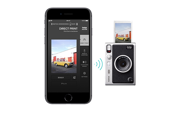 「instax mini Evo」をスマホプリンターとして活用することができる「ダイレクトプリント機能」や、カメラから離れた場所でも撮影できる「リモート機能」、「mini Evo」でプリントした画像をスマホに保存することができる「プリント画像保存機能」など、多彩な機能を搭載している。