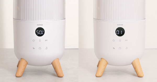 また、便利な機能が豊富で、タッチパネルによる簡単な操作が可能。例えば、50~80パーセントでの湿度設定だったり、1~12時間まで1時間刻みでの設定が可能なオフタイマー機能のほか、夜間に嬉しいナイトモードやUVライトの設定まで便利な機能が満載だ。リモコン操作は直線距離で約5メートル離れた場所からでも操作が可能で、湿度調整もミスト噴出量の調整もソファーやベッドからラクに操作することができる。