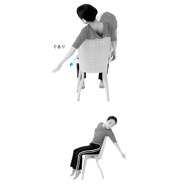 ちなみにこのストレッチは、背もたれのあるイスに座って行います。では、やってみましょう。