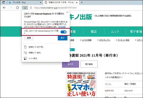 IEモードでページを開くと、画面上部に動作モードを示すウインドウが表示される。次回以降もIEモードで開きたい場合は、「次回、このページをInternet Explorerモードで開く」をオンにしておくと便利だ。