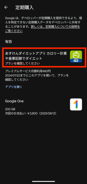 ▲継続して課金されるアプリが表示される。課金を止めたいものをタップ