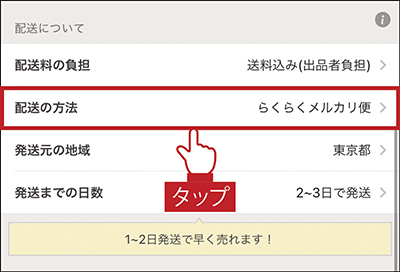 配送方法を決めるために、「配送の方法」をタップする