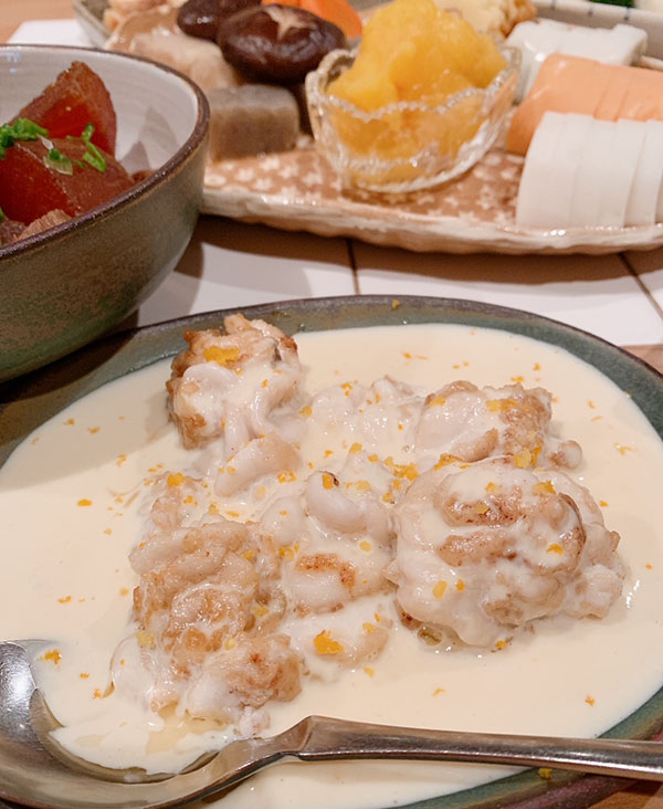 これはね、ああもう、美味しいとしか言えない。白子ってもともとクリーミーじゃないですか。そこに白味噌と生クリームを合わせたソースが絡まって、もう……(悶絶)。このソース、柚子果汁を少し加えてあるのが憎い。濃厚さの中に爽やかな香りが立って、このソースだけで酒が飲める(食欲旺盛な若者は、このソースをパンでぬぐって食べていました)。ムニエルというと洋酒を合わせたくなるけれど、これは辛口の日本酒ですね。少しにごった微発砲の辛口と合わせたい。合わせました!最高!