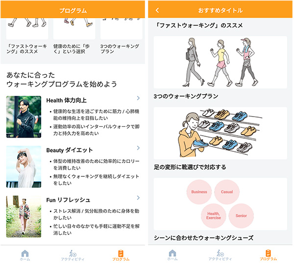 目的に合わせ応じた3つのプログラムと、アシックスが提供する関連のコンテンツで、ウォーキングの知識を深めることができる。