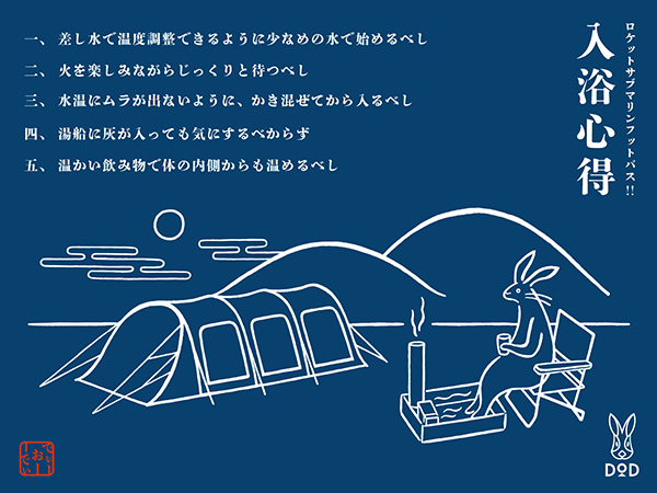 「 ロケットサブマリンフットバス」は、焚き火、熱燗、星空鑑賞 など、まったりとしがちな冬キャンプで、たまには新しいことにチャレンジしてみてもいいのでは?という発想から、ロケットストーブを水面に沈めて足湯を沸かす製品を実現した。「入浴心得」(取扱説明書)が付属されているので内容をしっかり読んでから楽しもう。
