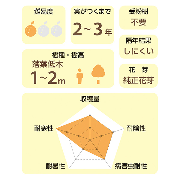 樹勢が強くないので鉢植えにも向く。ピンク色の花が楽しめる。花が多くつきすぎたときは摘果を。風味がよい。