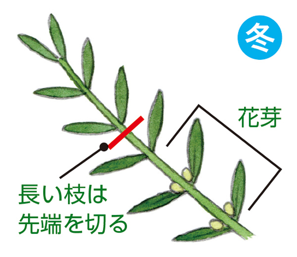 前の年に伸びた枝の中間あたりに花芽がつく。枝は先端を切っても花つきや実つきに影響しないので、伸びすぎた枝は先端を切る。