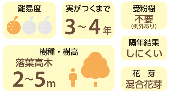| ネルソン | 不要 | 花粉あり | 遅咲きで、果実が大きくて甘い。小型の品種であまり背が高くならないので、せまい庭に向く。 |