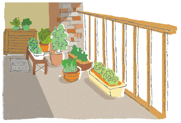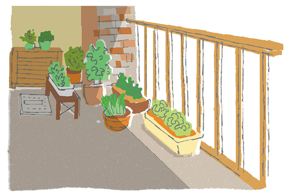 直射日光で熱せられたコンクリートのベランダは、植物にとって過酷な場所です。床にじかにコンテナを置かない工夫をしましょう。