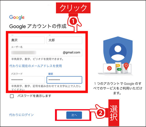 氏名を入力する。続いて、使用したいユーザー名とパスワードを入力し、「次へ」をクリック。