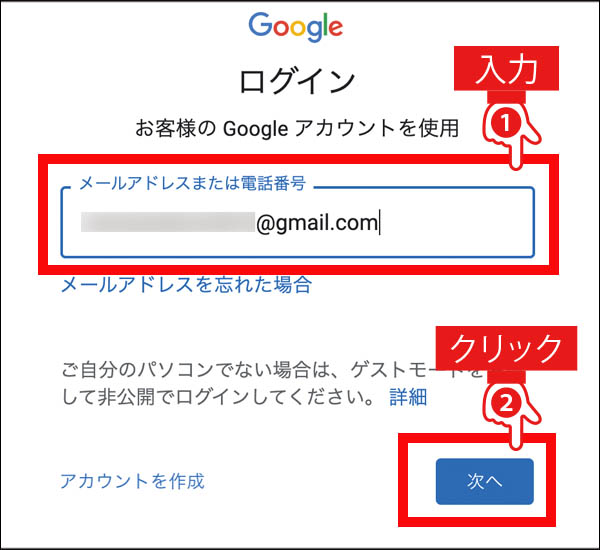 ログイン画面が表示されたら、Google アカウントを入力して「次へ」をクリックする。