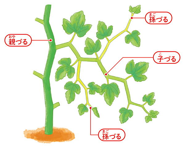 よい果実を収穫するには芽かきをします。トマトやピーマン、ナスなどは不要な枝をつけないためにわき芽をかき取り、日当たりや風通しをよくして実を大きく育てます。
