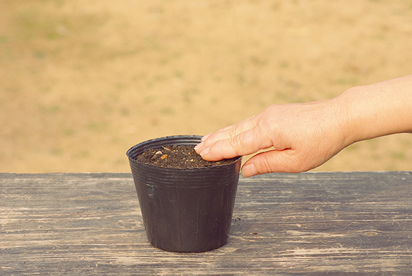 (4)手のひらで軽く押さえタネと土を密着させてから、水をやる