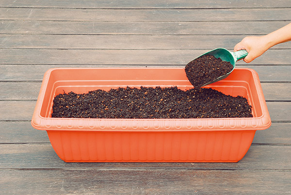 コンテナでの野菜づくりはここからスタートします。野菜づくりは、タネをまくか、苗を購入して植え付けるかですが、どちらにしてもコンテナ栽培は、コンテナに用土を入れることから始まります。