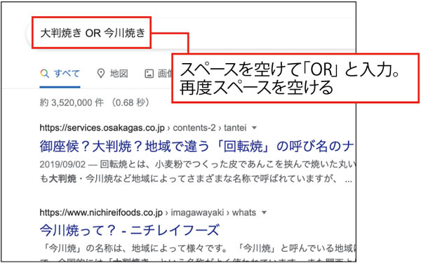AとB、両方の情報を同時に調べたいときは、AとBの間に空白をはさみ「OR」を入力しよう。これで、ABいずれかの情報を含んだウェブサイトが表示される。たとえば、「今川焼」のように人によって呼び方が異なるものを調べるのに役立つ。