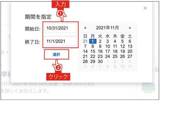 「期間を指定」をクリックすると、開始日と終了日を設定できる。入力し終えたら「選択」をクリックする。