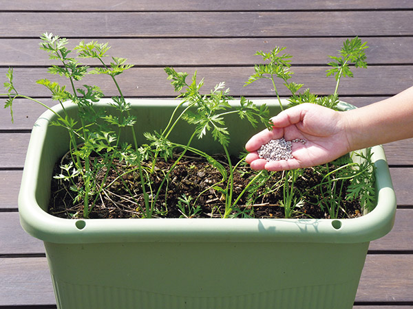 (3)間引き後、化成肥料10gをコンテナ全体にまき、1回目の追肥を施す。土に軽く混ぜて、株元に寄せる