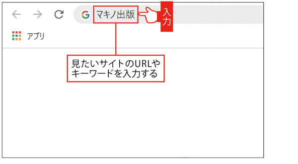 アドレスバー欄をクリックし、サイトのURLやキーワードを入力。[Enter]キーを押して検索する。