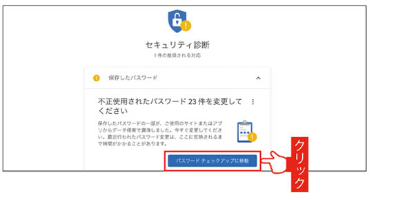 Googleアカウントの「ホーム」画面が表示されたら、「アカウントの保護」をクリック。「セキュリティ診断」画面で「パスワードチェックアップに移動」をクリックする。