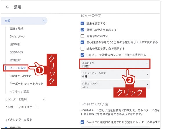 「設定」→「設定」をクリック。左側の「ビューの設定」→「週の始まり」欄をクリックすると変更できる。